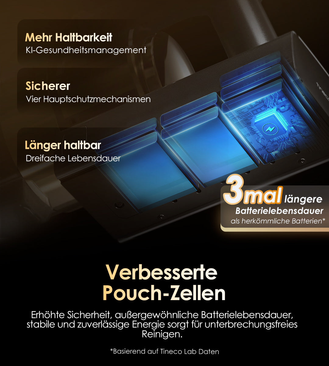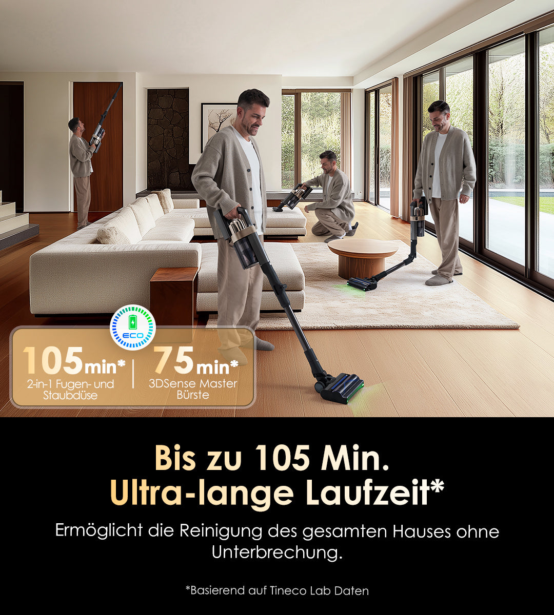 Bis zu 105 Minuten längere Laufzeit (Eco-Modus mit 2-in-1 Fugendüse) ermöglicht eine unterbrechungsfreie Reinigung des gesamten Hauses.