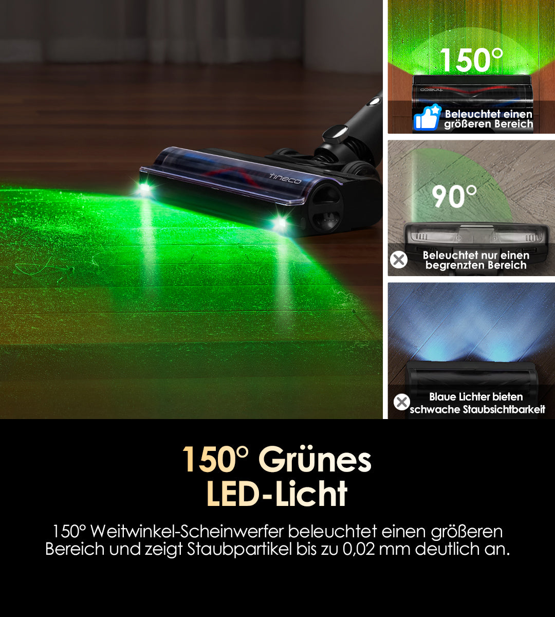 Der 150° Weitwinkel-Scheinwerfer beleuchtet einen größeren Bereich und macht Staubpartikel bis zu 0,02 mm deutlich sichtbar.