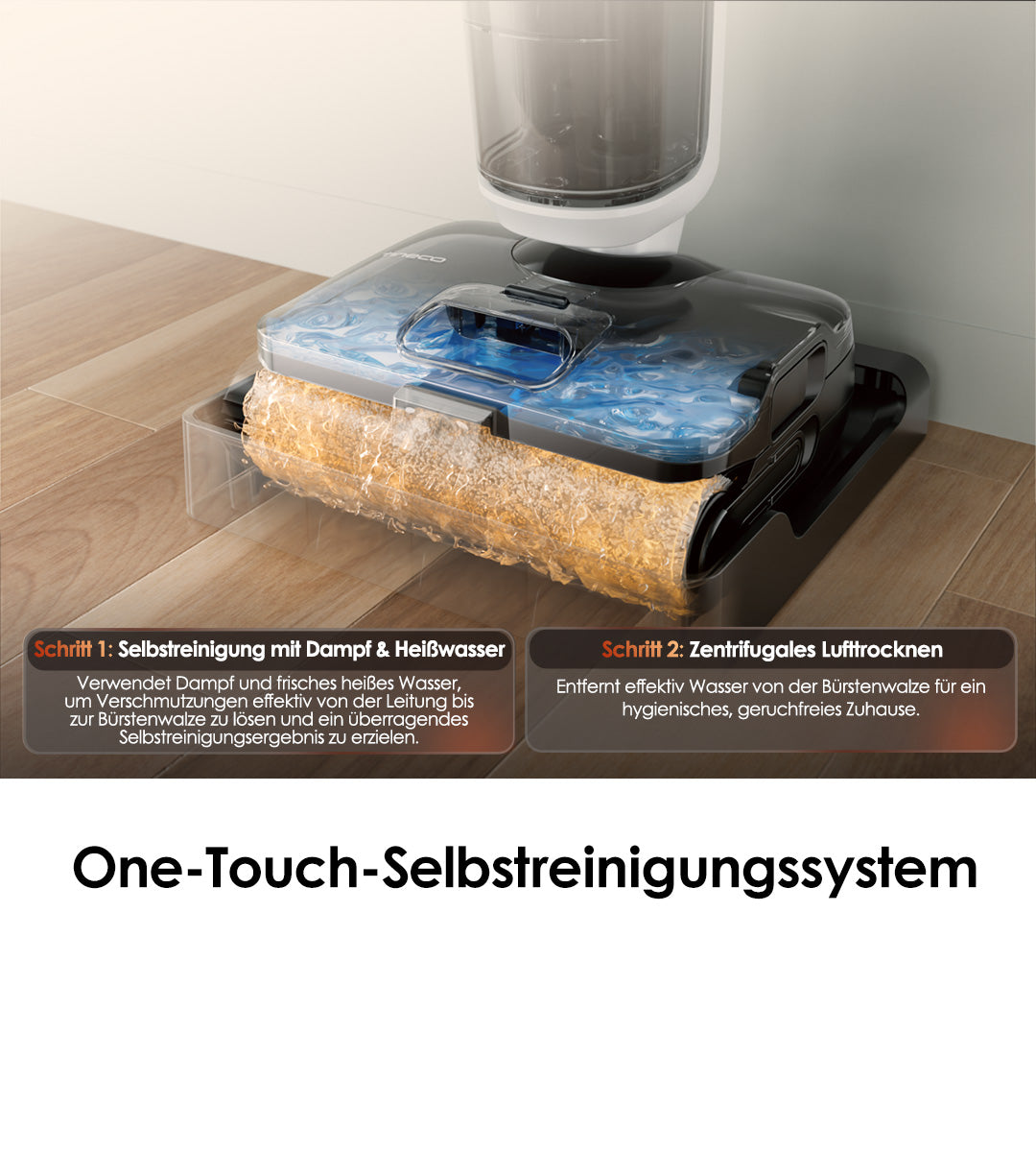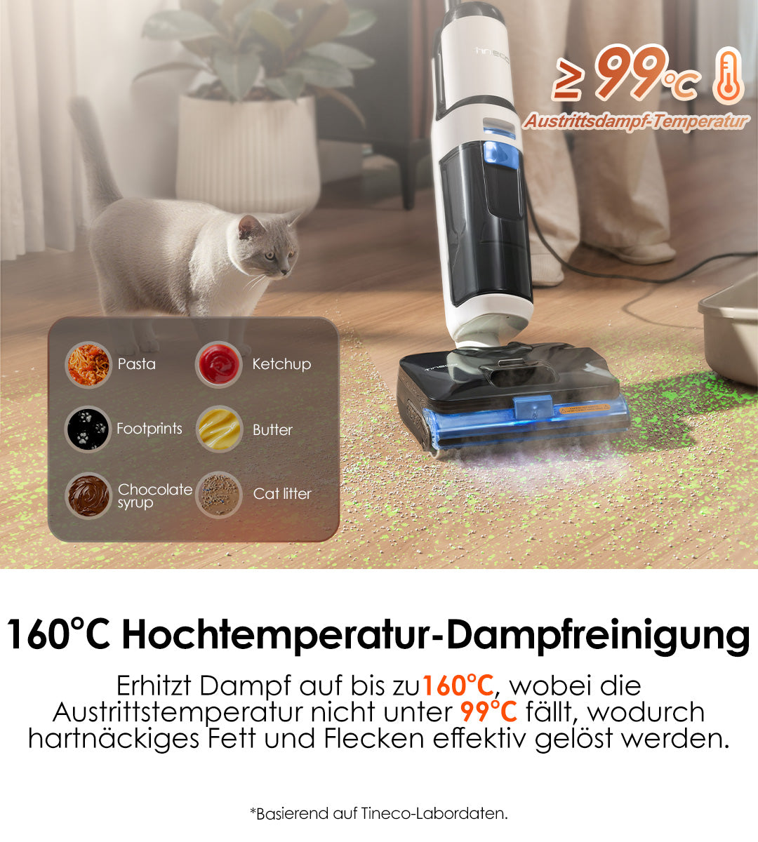 Erhitzt den Dampf auf bis zu 160°C und sorgt dafür, dass die Austrittstemperatur nicht unter 99°C fällt, wodurch hartnäckiges Fett und Flecken effektiv gelöst werden.