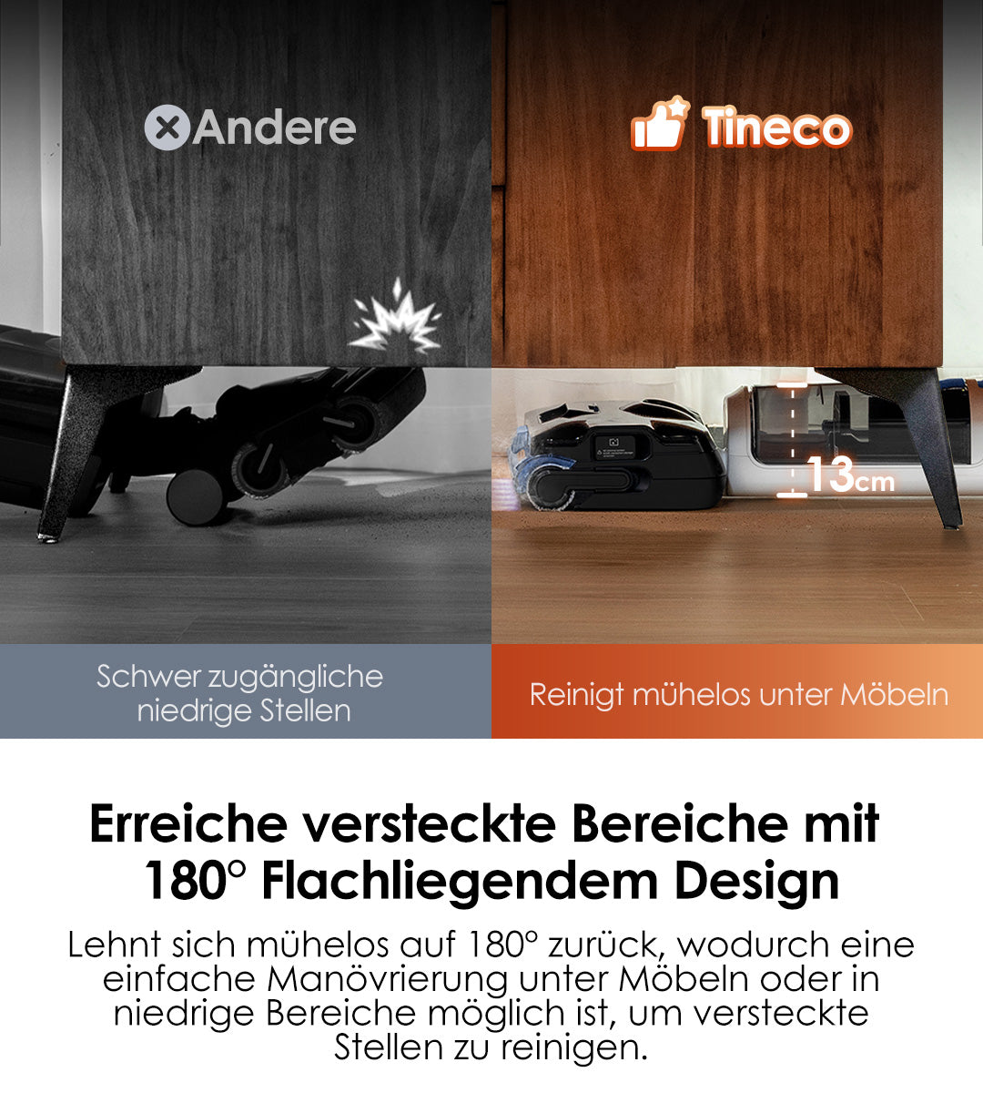 Mit schlankerem Gehäuse und einer Höhe von nur 13cm im flach gelegten Zustand manövriert er mühelos unter Möbeln und in niedrige Bereiche, um versteckten Staub zu entfernen.
