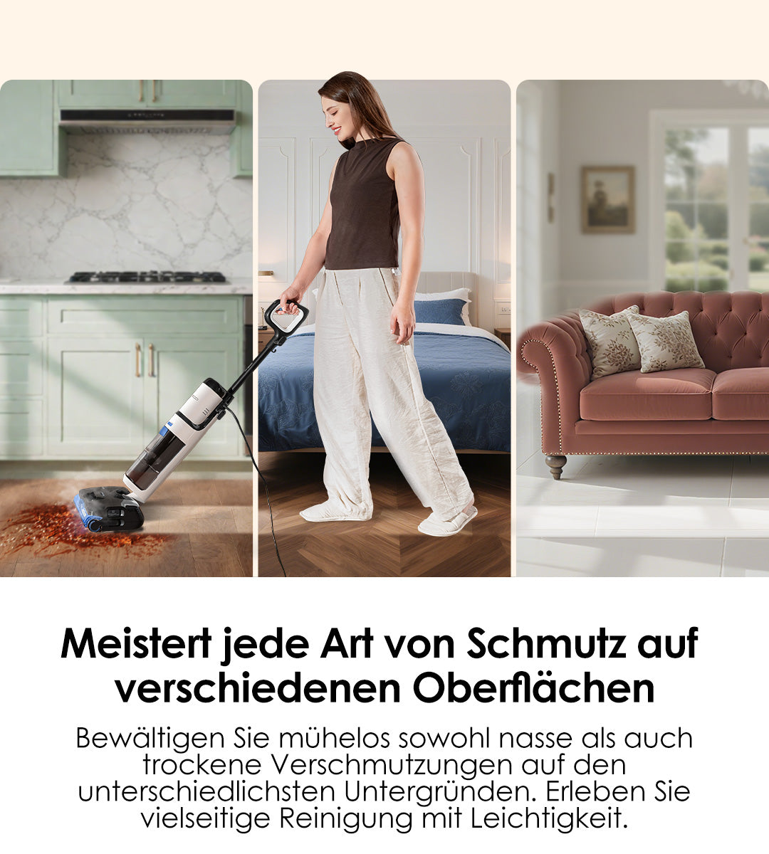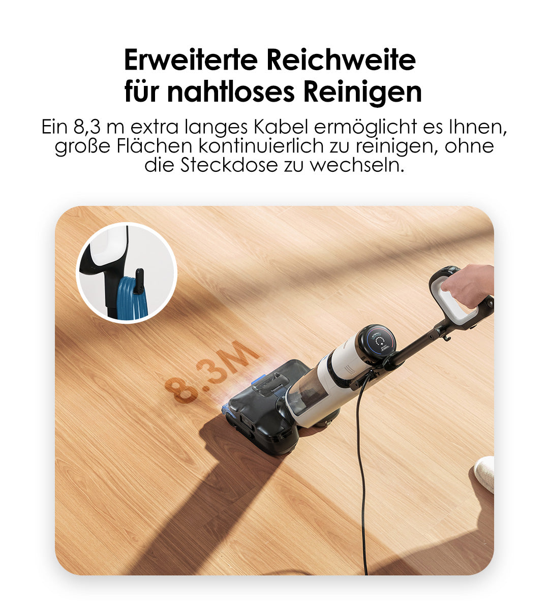 Reinigt mühelos große Flächen, ohne den Stecker ziehen zu müssen, und gewährleistet eine unterbrechungsfreie Leistung.