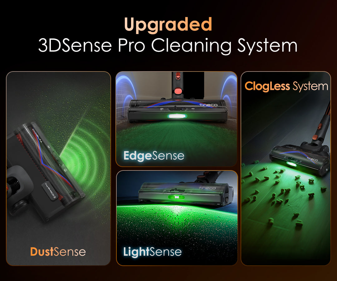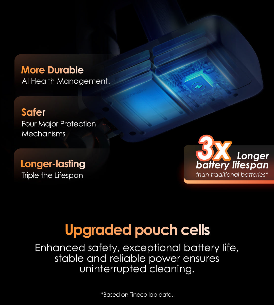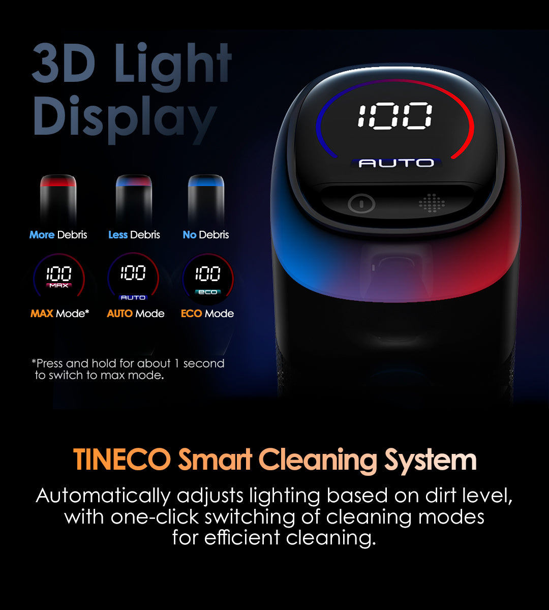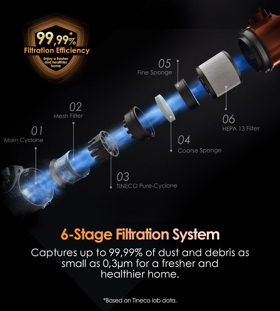 Captures up to 99.99% of dust and debris as small as 0.3μm for a fresher and healthier home. *Based on Tineco Lab.