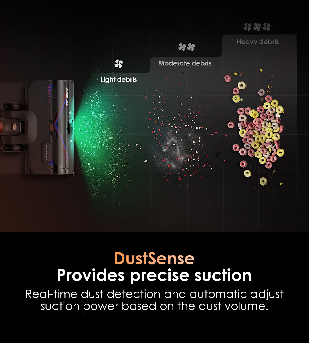 Precise suction with real-time dust detection and automatic power adjustment based on dust volume.