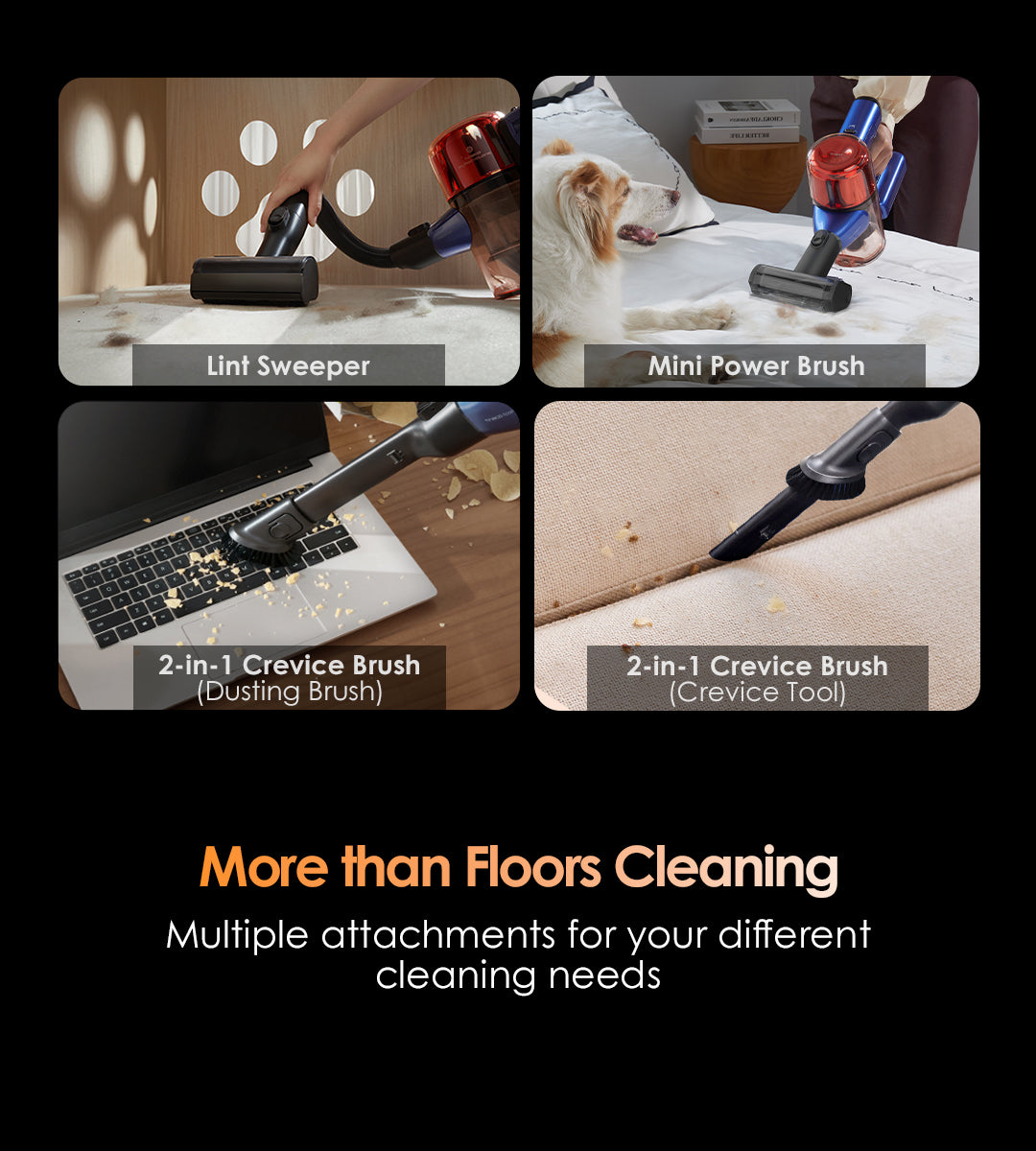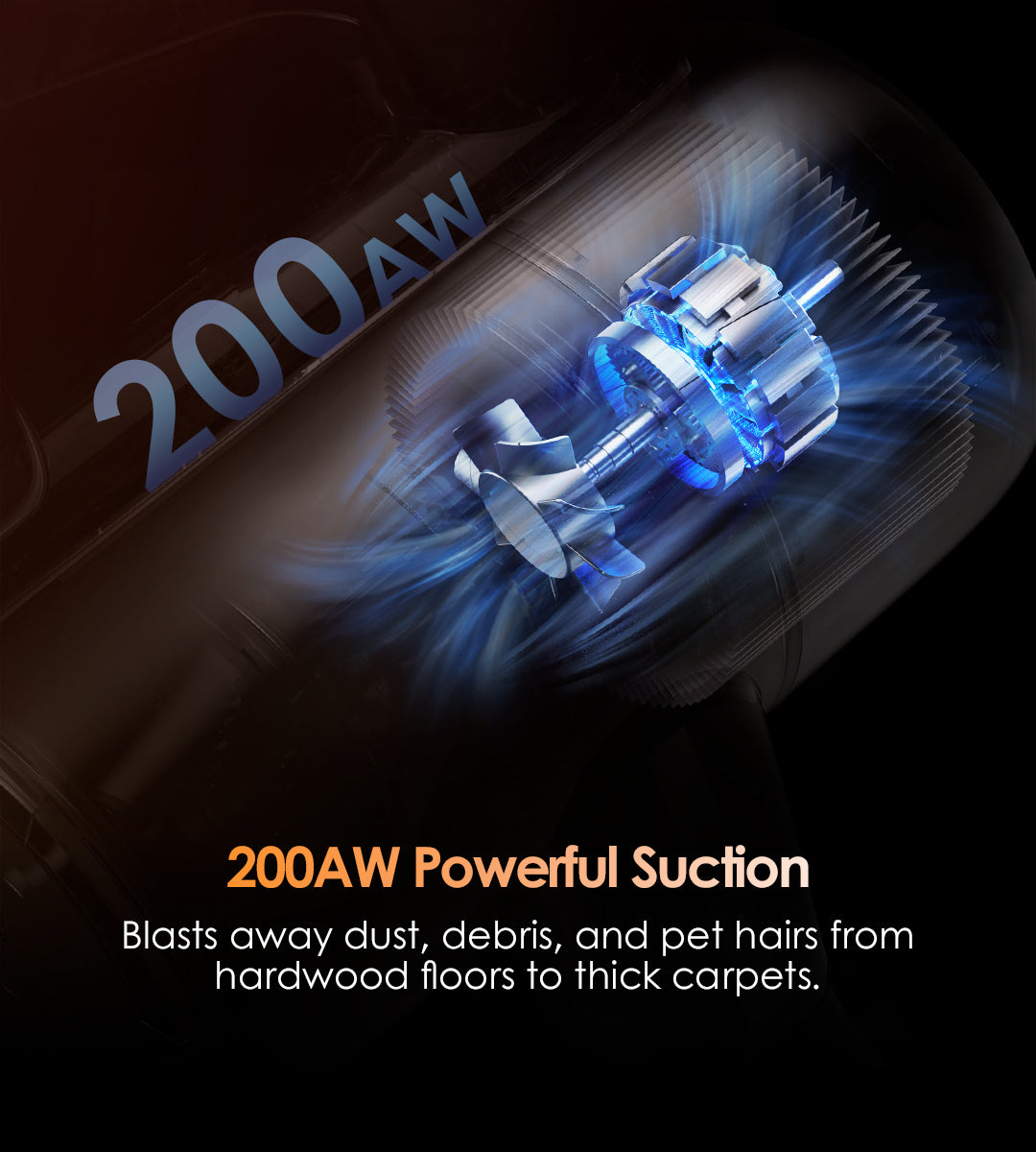Blasts away dust, debris, and pet hairs from hardwood floors to thick carpets.
