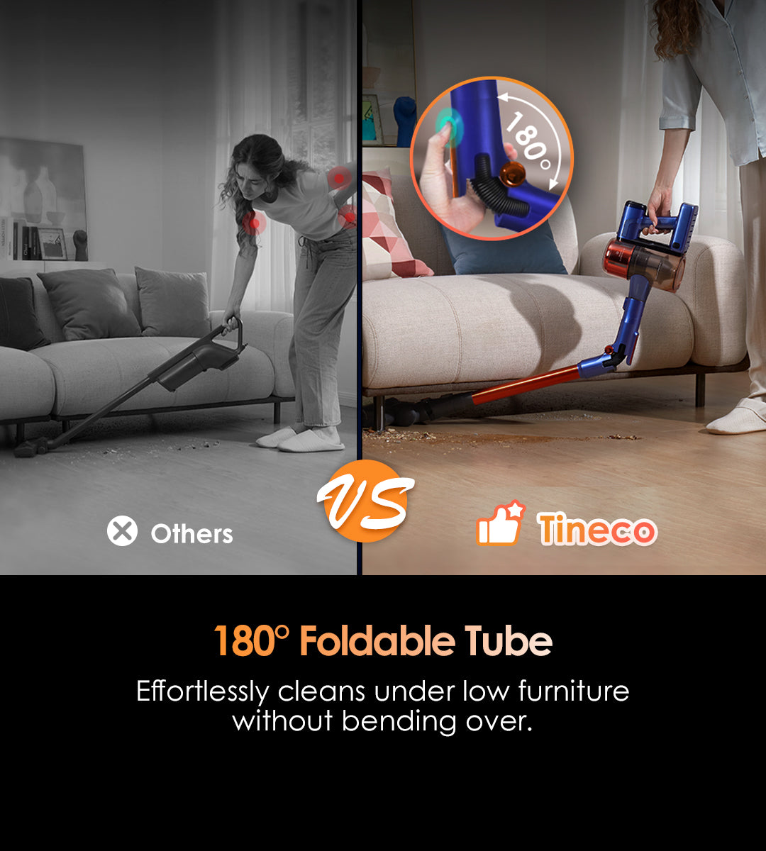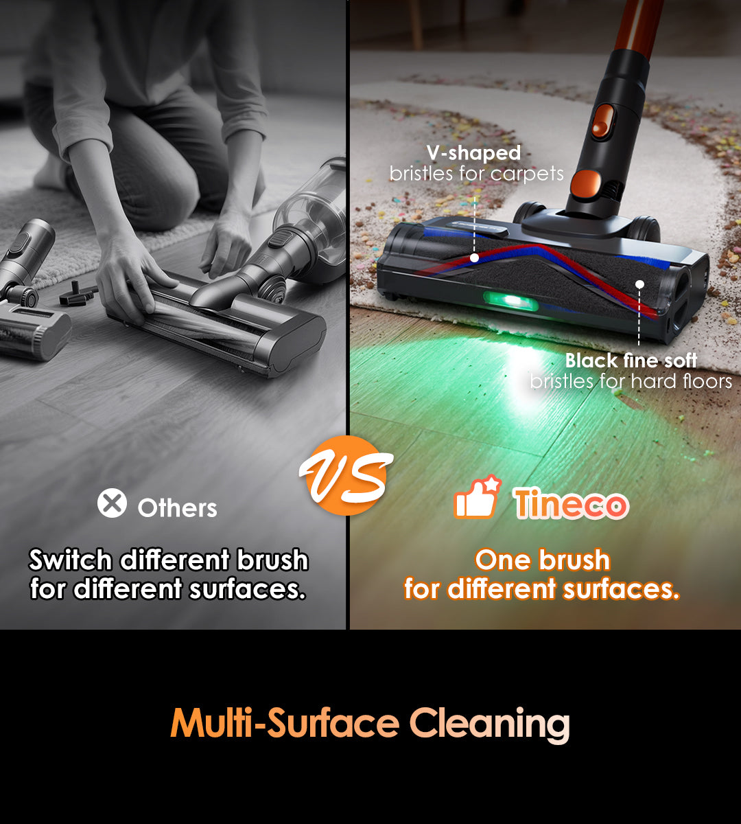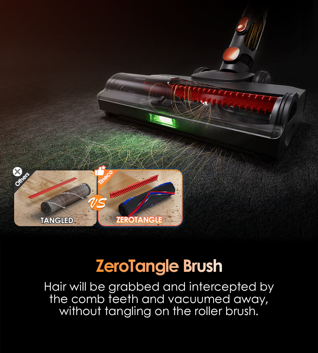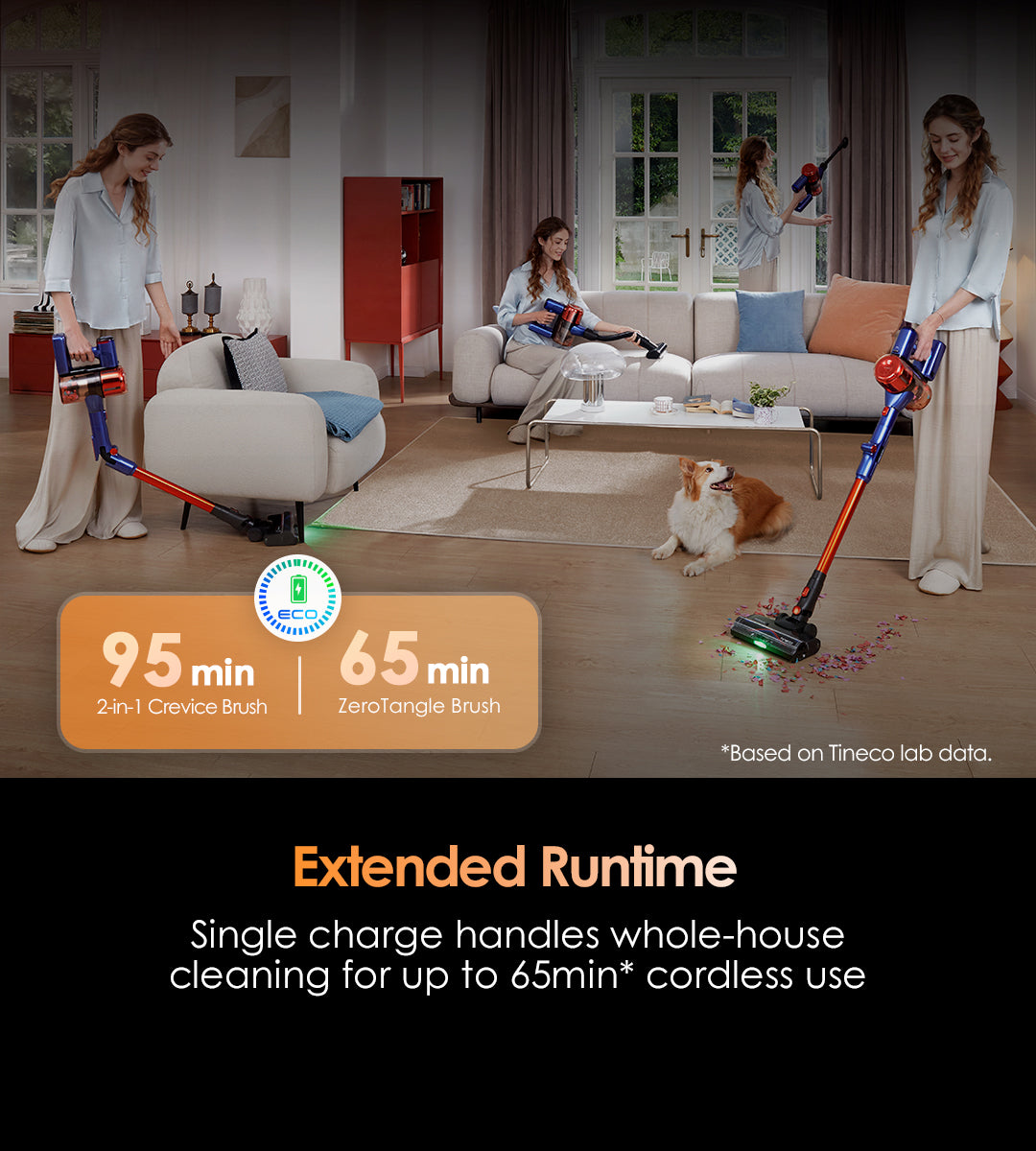 Up to 95* minutes in Eco Mode using the 2-in-1 Crevice Brush and 65* minutes with the ZeroTangle Brush. *Based on Tineco lab data.
