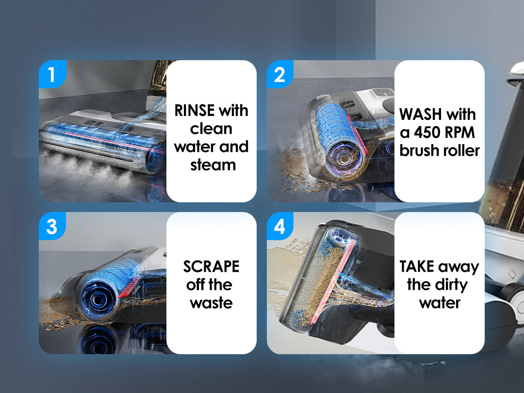 The high-temperature steam melts away stuck-on grease and stains. Then the soft brush roll cleans the floor with fresh water for an effortless, thorough clean.