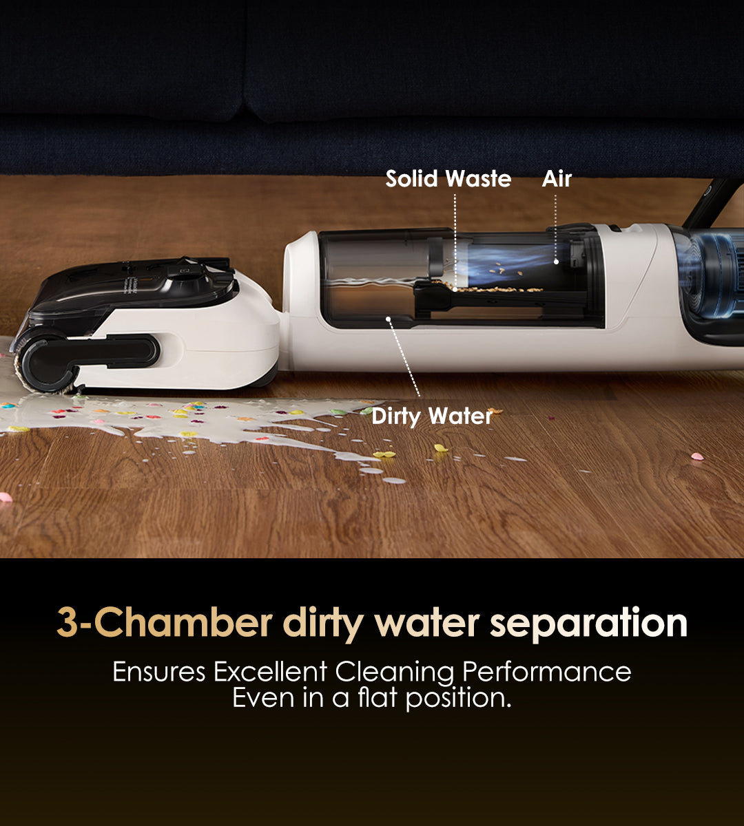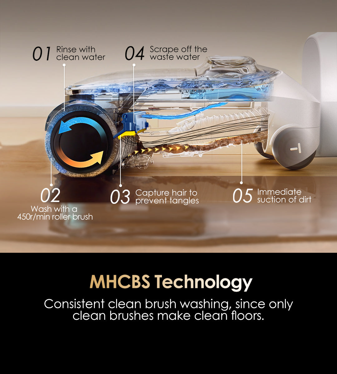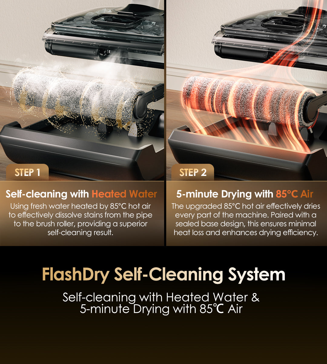Using heated fresh water to effectively dissolve stains from the pipe to the brush roller, and then using 85°C hot air to effectively dry every part of the machine. Truly worry-free after use.