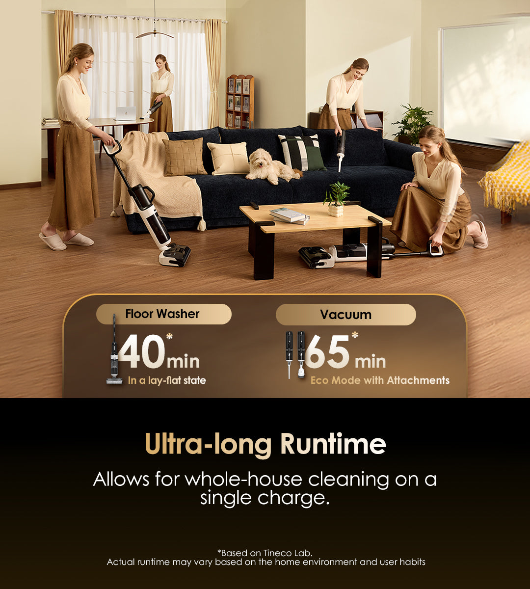 Myjka podłog: 40 min (w pozycji leżącej);Odkurzacz: 65 min (tryb eco z akcesoriami)