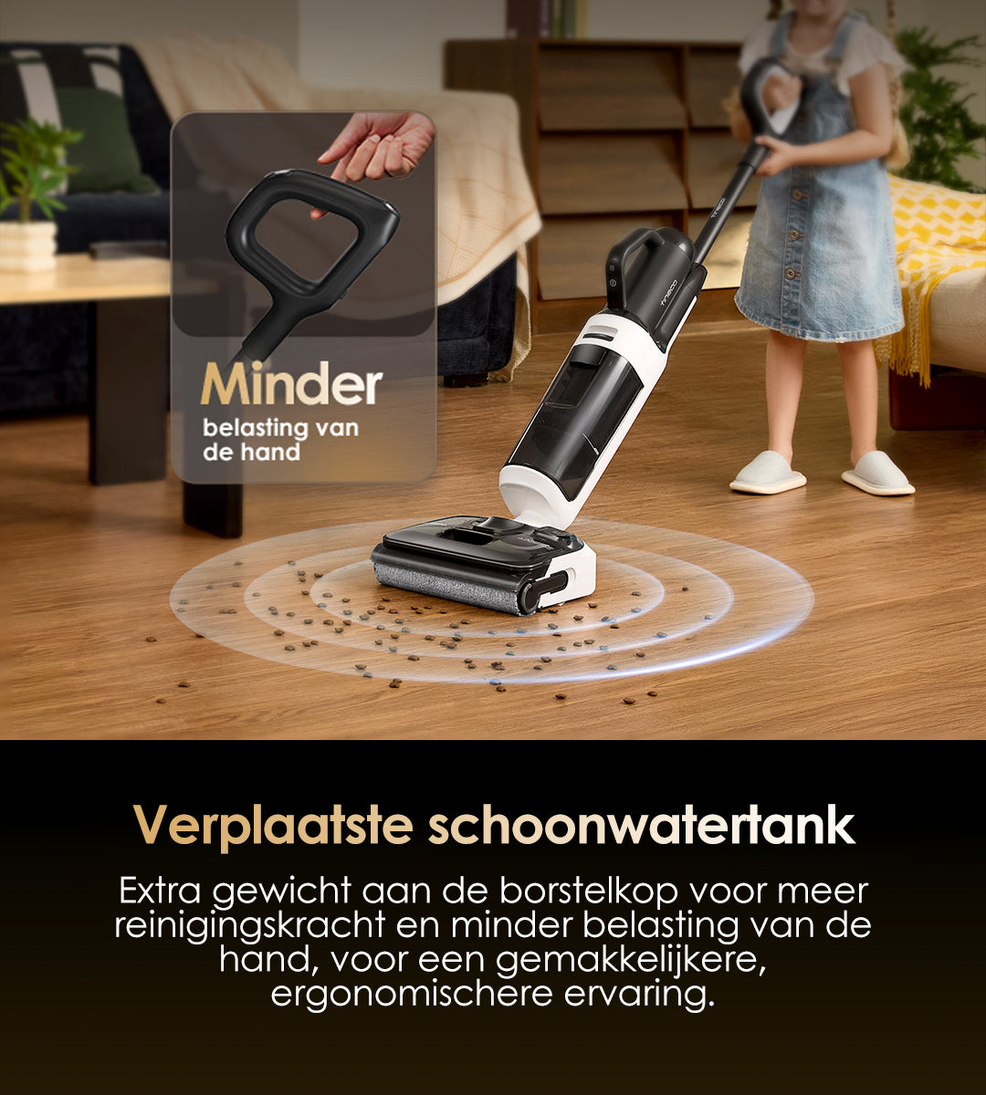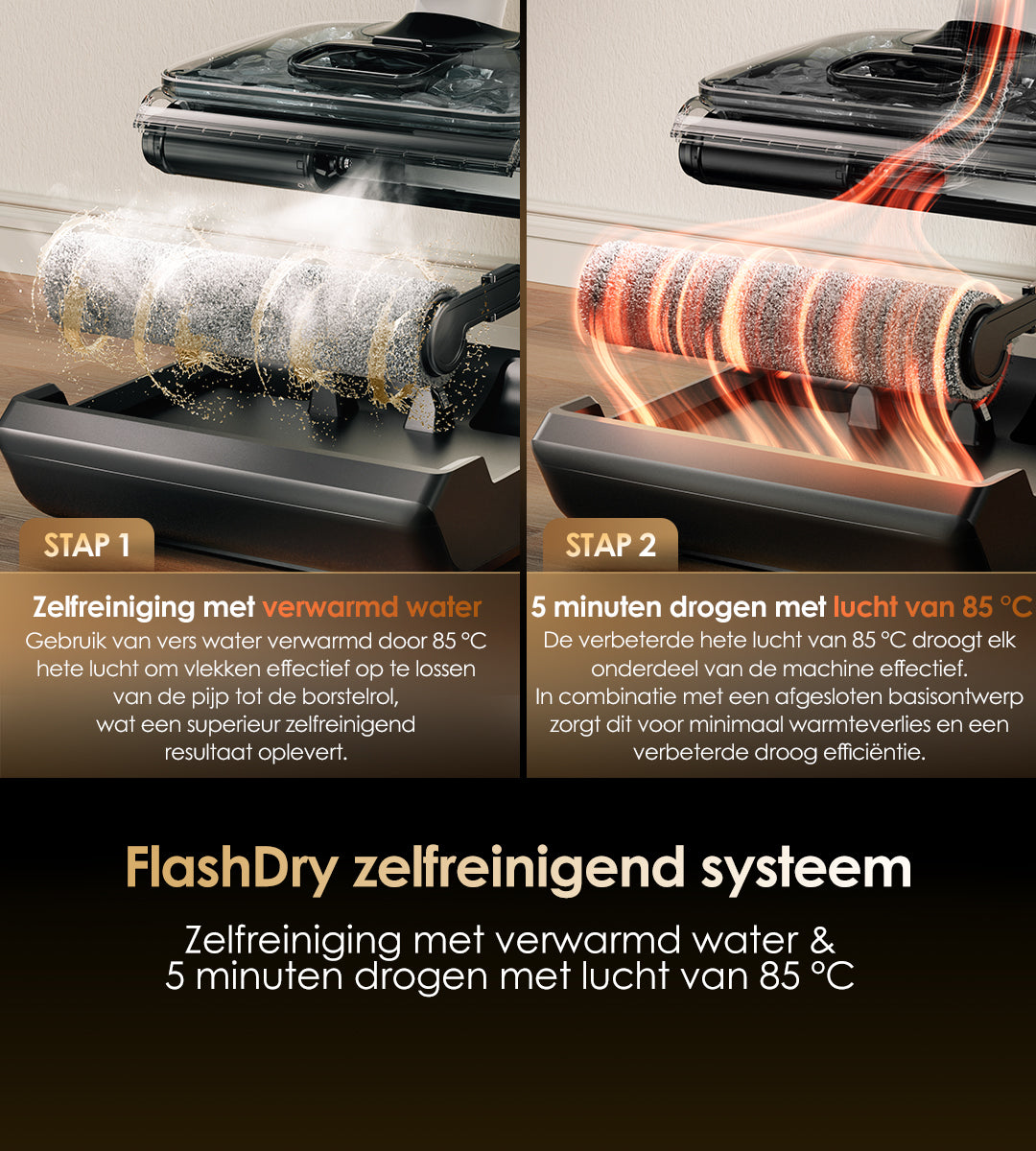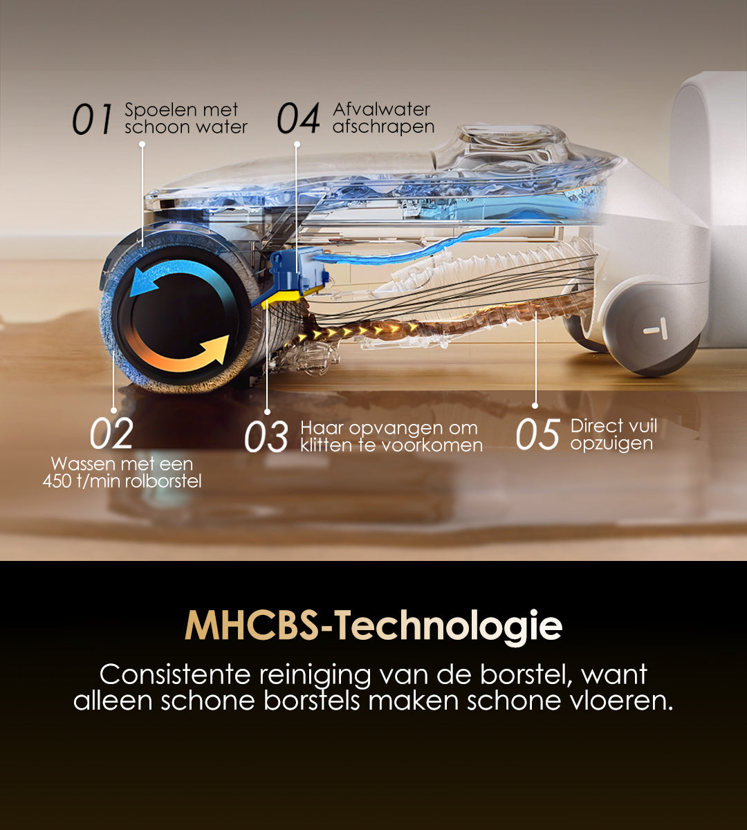 Gebruikt verwarmd zoet water om vlekken effectief op te lossen van de buis tot de borstelrol, en gebruikt vervolgens hete lucht van 85℃ om elk onderdeel van de machine effectief te drogen. Dit systeem zorgt ervoor dat je niet meer hoeft te dweilen en moppen met een traditionele stofzuiger.