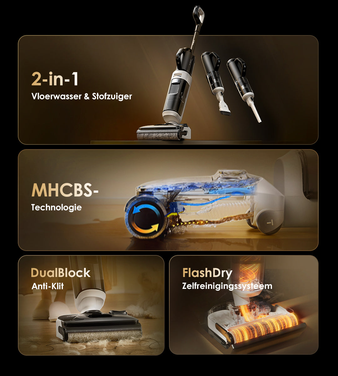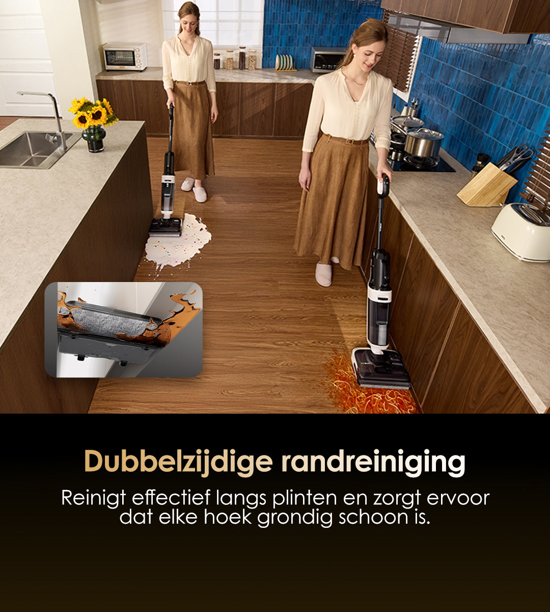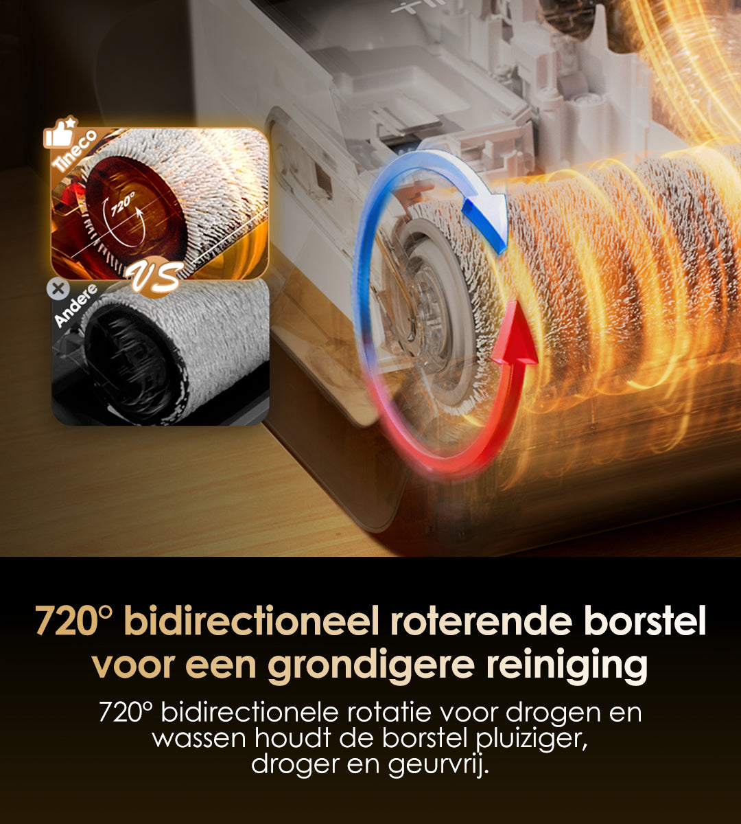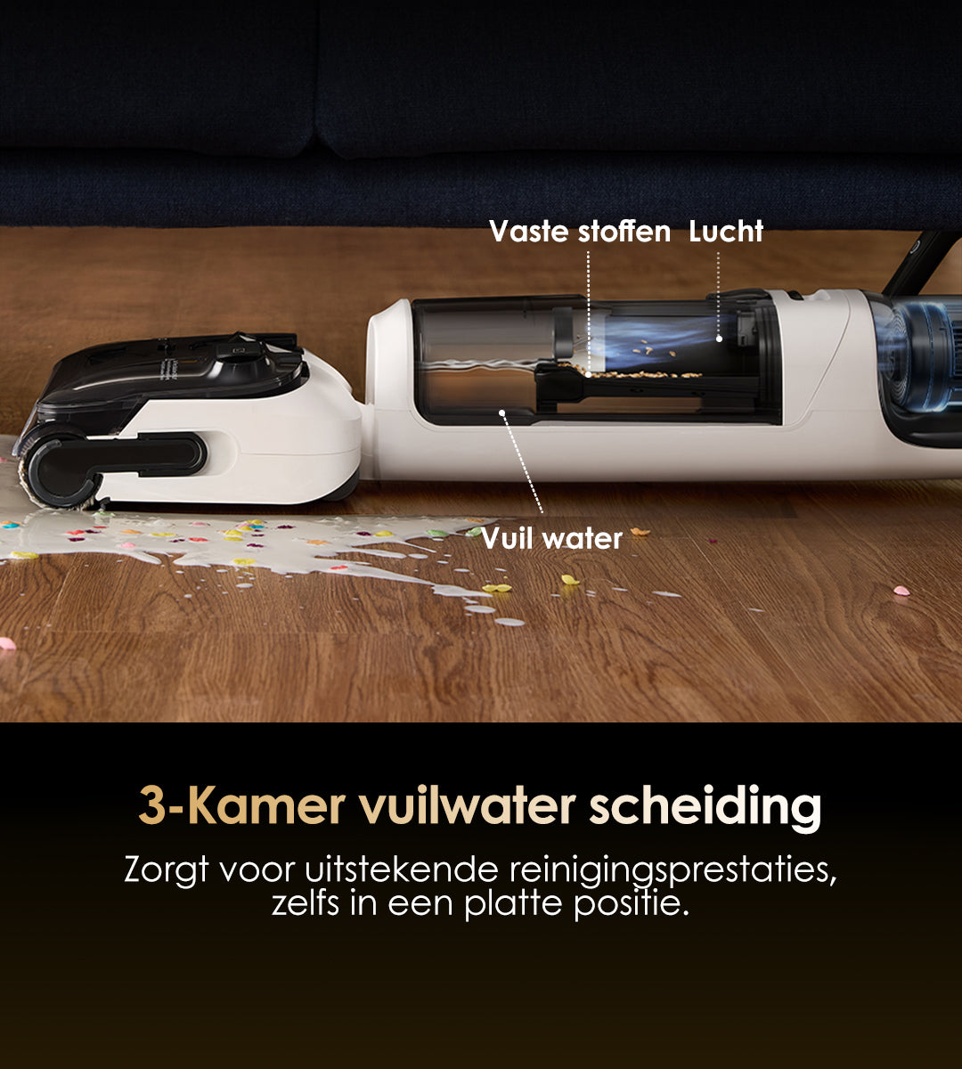 Gebruikt verwarmd zoet water om vlekken effectief op te lossen van de buis tot de borstelrol, en gebruikt vervolgens hete lucht van 85℃ om elk onderdeel van de machine effectief te drogen. Dit systeem zorgt ervoor dat je niet meer hoeft te dweilen en moppen met een traditionele stofzuiger.