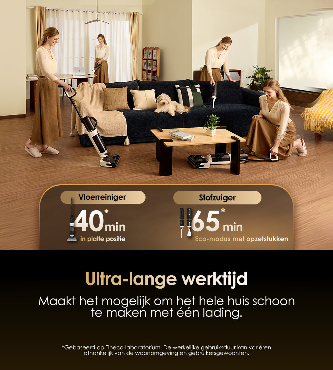Vloerreiniger: 40 min (in ligstand); Stofzuiger: 65 min (eco-modus met accessoires)