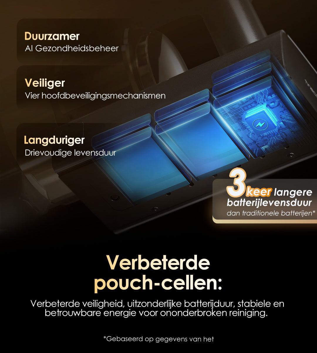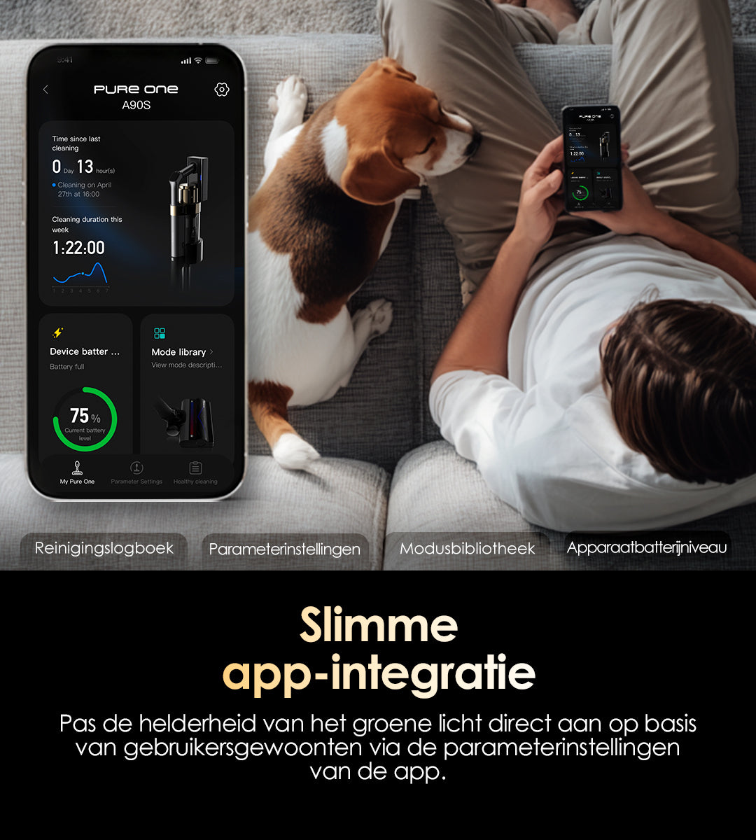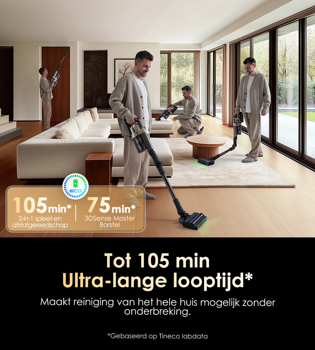 Tot 105 minuten extra looptijd (Eco-modus met 2-in-1 Kierenborstel) voor een onderbrekingsvrije reiniging van het hele huis.