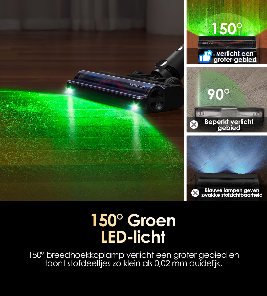 De 150° groothoekkoplamp verlicht een groter gebied en maakt stofdeeltjes tot 0,02 mm duidelijk zichtbaar.