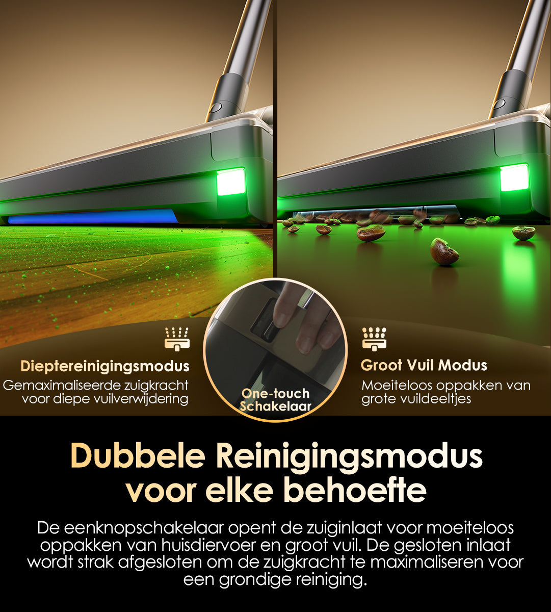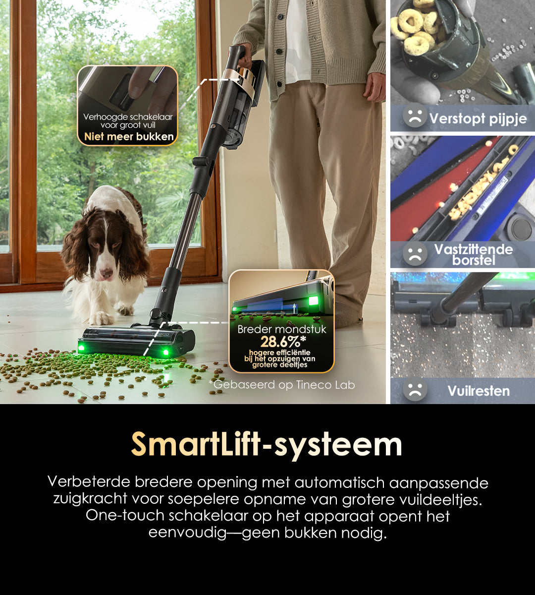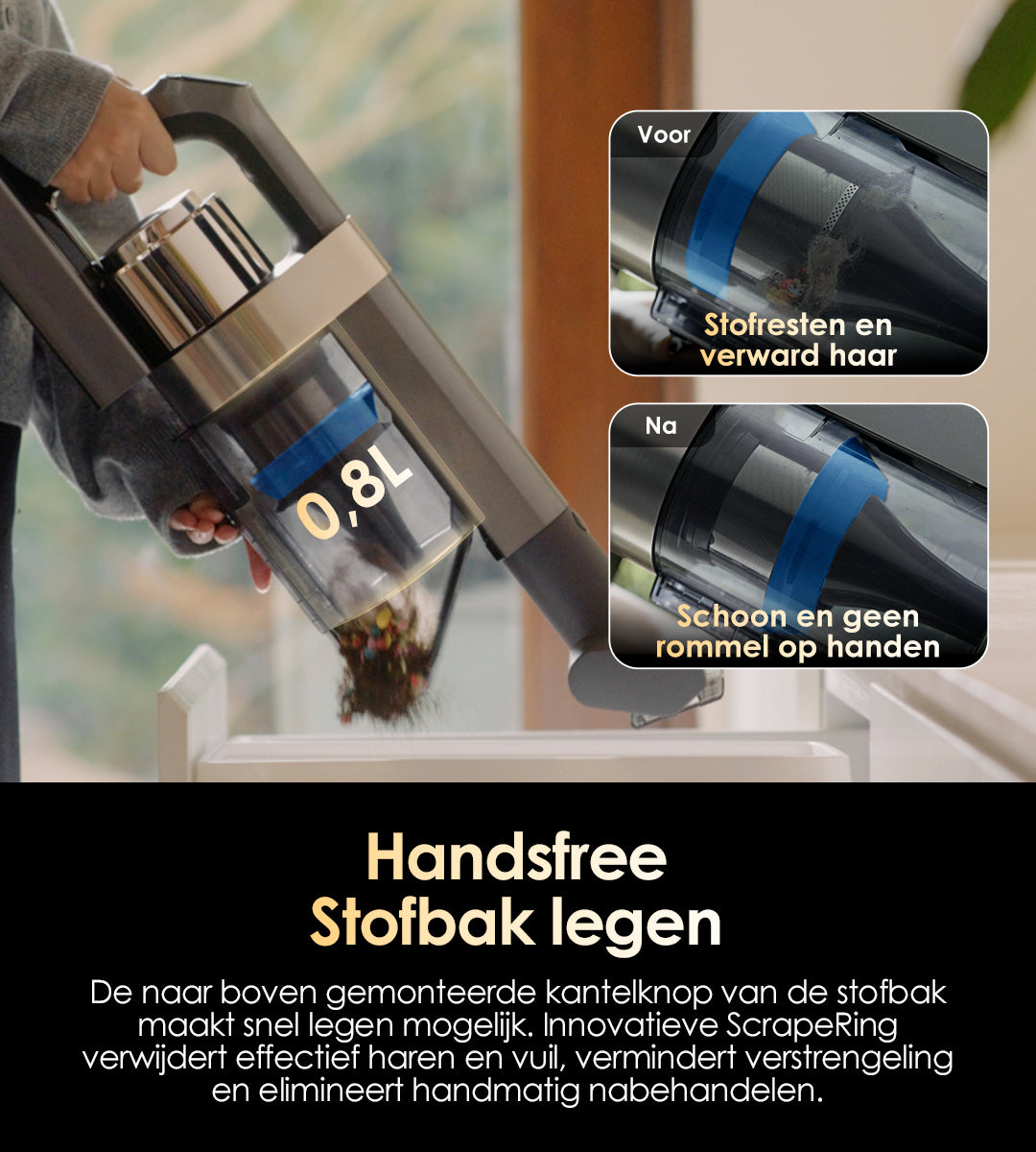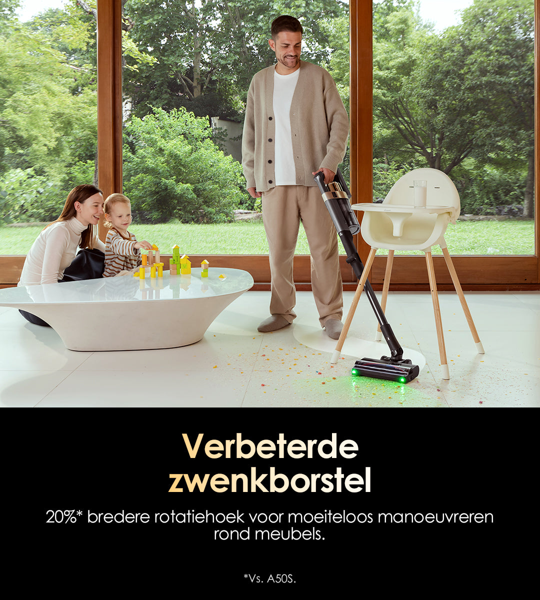 Met de afstelling op vloerniveau, de schakelaar aan de handgreep en automatische detectie verwerkt het nieuwe systeem moeiteloos groter vuil zonder verstopping – bukken is niet nodig.